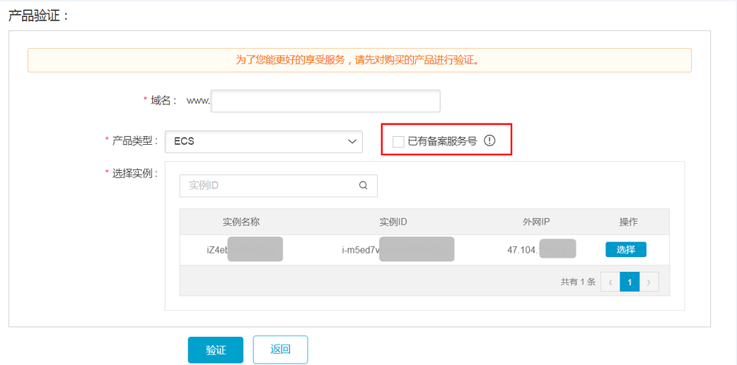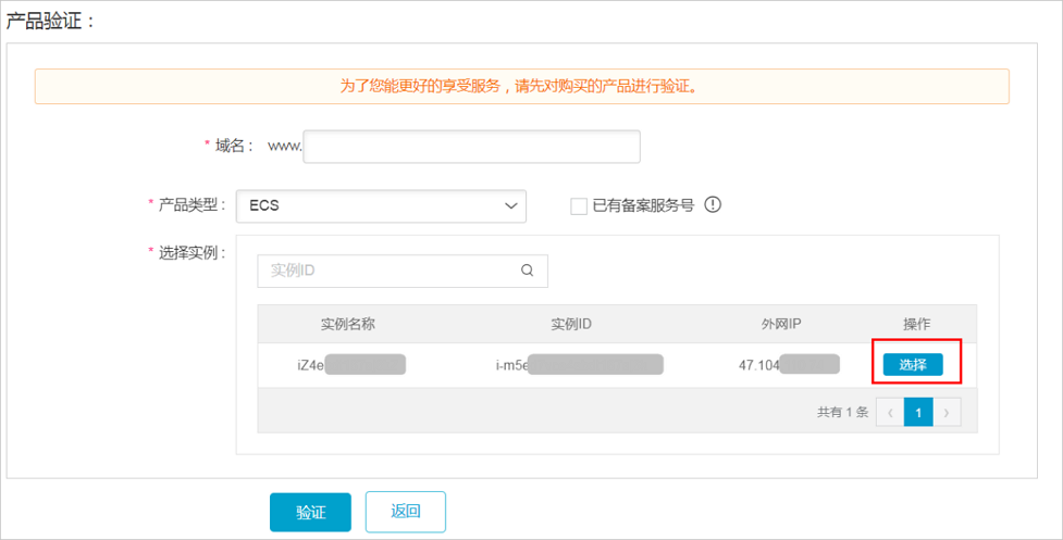 • 方式一(推荐):选择当前阿里云备案帐号下的产品类型,选择已购买的产品实例,完成验证。
