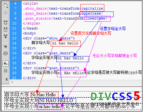 这里DIVCSS5介绍了css text-transform实现首字母大写、英文字母全小写、英文字母全大写使用与语法。如果要掌握可以复制DIV CSS大写小写案例代码亲自实践,灵活运用。对于文字排版,特别是英文或拼音字母要求大小写首字母大小写均可使用text-transform样式属性