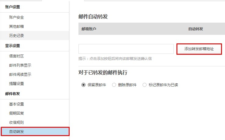 1、邮箱设置界面左侧功能列表中选择 邮件收发 > 自动转发 > 添加转发邮箱地址 。
