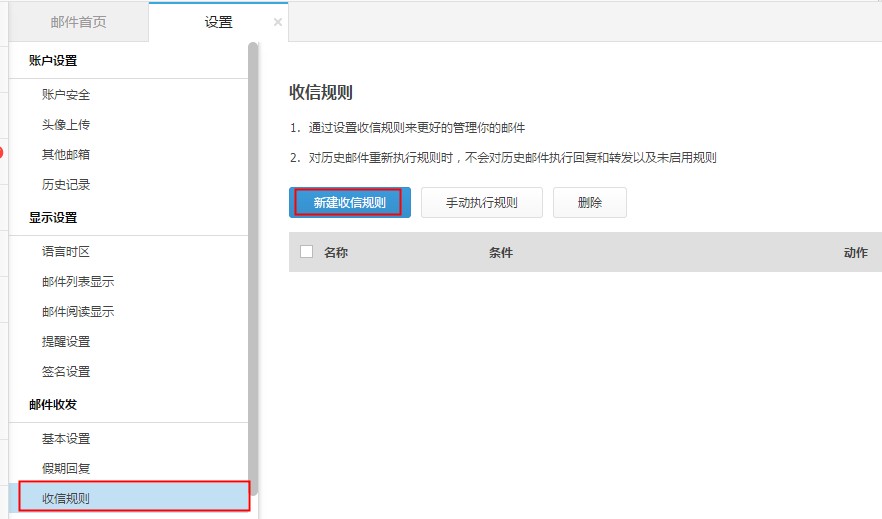 1、邮箱设置界面左侧功能列表中选择 邮件收发 > 收信规则 > 新建收信规则 。